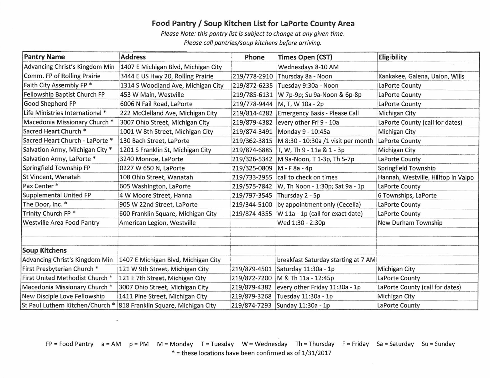 La Porte Regional Health Financial Counselors (phone (219) 326-1234) can advise people on how to get free or low cost health care, and other options such as how to negotiate medical bills. Learn more.